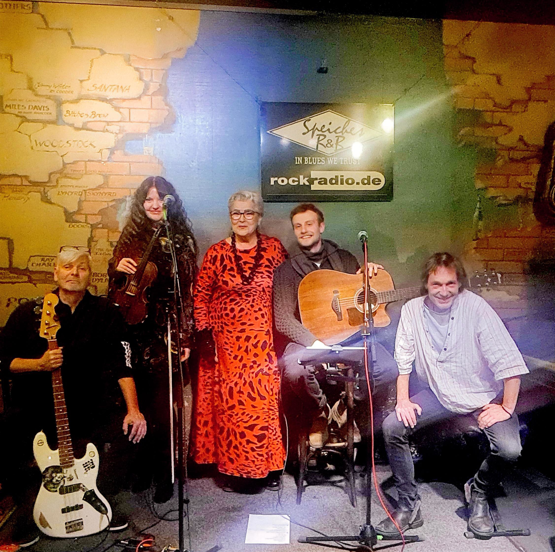 … hier moderiere ich in „Speiche’s Rock- und Blueskneipe“ in Berlin-Prenzlauer Berg für rockradio.de – mit schlechtem Licht fürs Foto – am 30. Dezember 2025 eine live-Sendung mit live-Musik von Maike Virk & Band …